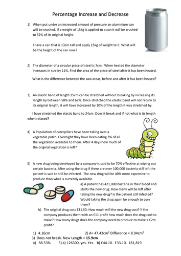 Percentage increase and decrease - WorksheetMath Percentage increase and decrease A worksheet where you have to increase or decrease a given amount by a specified percentage. Number of problems 10 problems. 20 problems 40 problems Options Use whole numbers only, i.e. for non-calculator practise. Answer sheet Include answer sheet. Save worksheet Worksheet name: SAVE Save failed Save worksheet